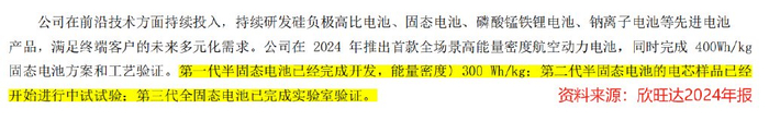2024年年报披露,公司第一代半固态电池已经完成开发,第二代半固态电池电芯样品已开始中试试验,第三代聚合物复合全固态电池完成了实验室验证,预计2025年完成产品开发。