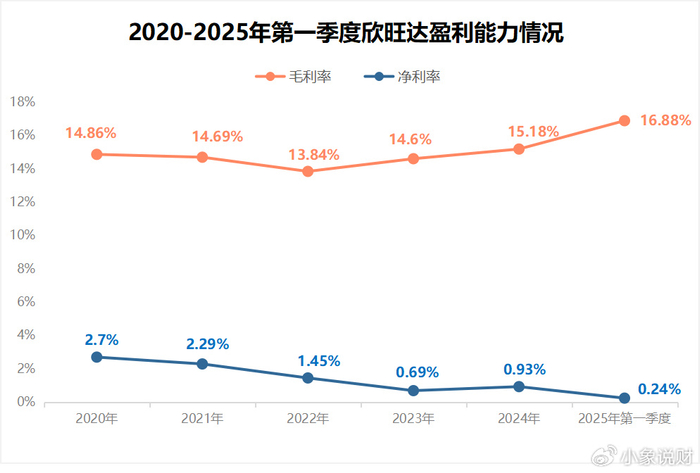 2020到2025年第一季度,欣旺达净利率从2.7%下降到0.24%。用更直观的方式来说,2025年第一季度,公司每卖出100元的产品,净利润已不足1元,盈利水平显著承压。