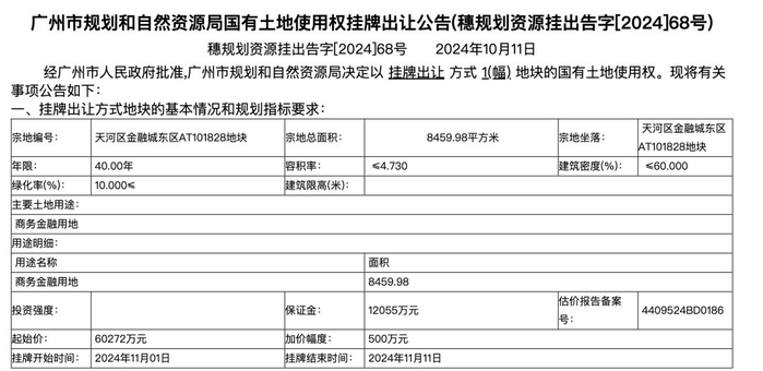 根据广州市规划和自然资源局相关信息,这一地块总用地面积约8460平方米,规划建筑面积约4万平方米,容积率4.73。地块所开发项目的产业类型为软件、游戏产业,起始价60272万元,最终该地块底价成交。