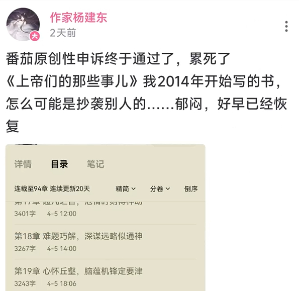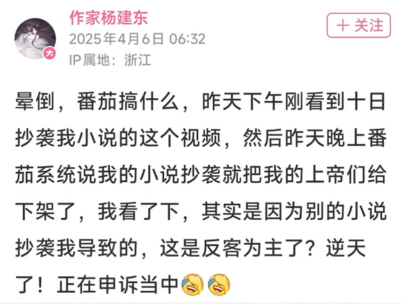 4月6日,《上帝们的那些事》作者杨建东回应:“晕倒,番茄搞什么,昨天下午刚看到十日抄袭我小说的这个视频,然后昨天晚上番茄系统说我的小说抄袭就把我的上帝们给下架了,我看了下,其实是因为别的小说抄袭我导致的,这是反客为主了?逆天了!正在申诉当中。”