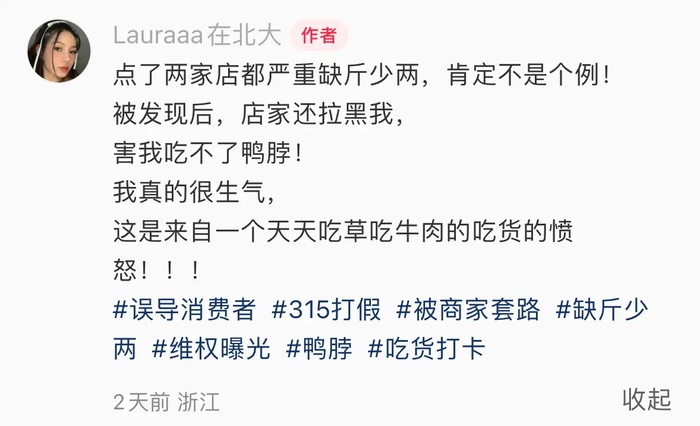 博主曝光在多门店买绝味鸭脖均缺斤短两,退款后门店甚至将其拉黑