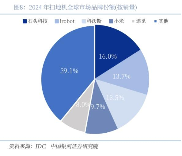 其中,2024年石头全球扫地机销量345万台,同比+32.9%(公司公告)。根据IDC数据,2024年全球扫地机 2060万台,同比+11.2%,石头销量市场份额16.0%,首次排名第二,其中中国市场排名第二,仅次于科沃斯;海外市场排名第二,仅次于iRobot。表明公司压低利润,提升份额的市场策略有效。