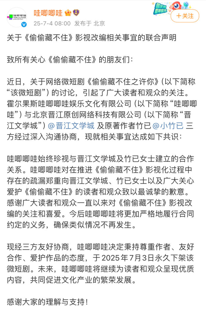 现经三方友好协商,哇唧唧哇决定于2025年7月3日永久下架网络微短剧《偷偷藏不住之许你》。
