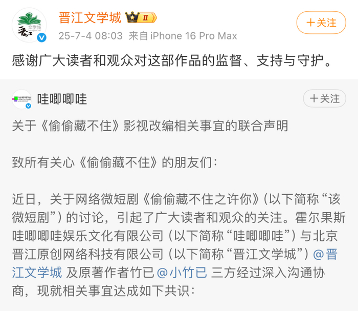 此前,晋江文学城与哇唧唧哇因短剧版权纠纷冲上热搜。晋江联合原著作者竹已发布声明,控诉哇唧唧哇即将上线的微短剧《偷藏不住之许你》涉嫌违反合同约定,构成对原著版权侵害。