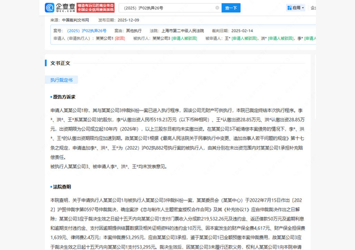 案件执行信息显示,2022年9月,上海嘉珥文化已被强制执行约90万元。今年8月,法院进一步发布公告,追加自然人李某某为被执行人,要求其在认缴出资额519.23万元范围内,对上海嘉珥文化未能清偿的上述仲裁债务承担补充赔偿责任。