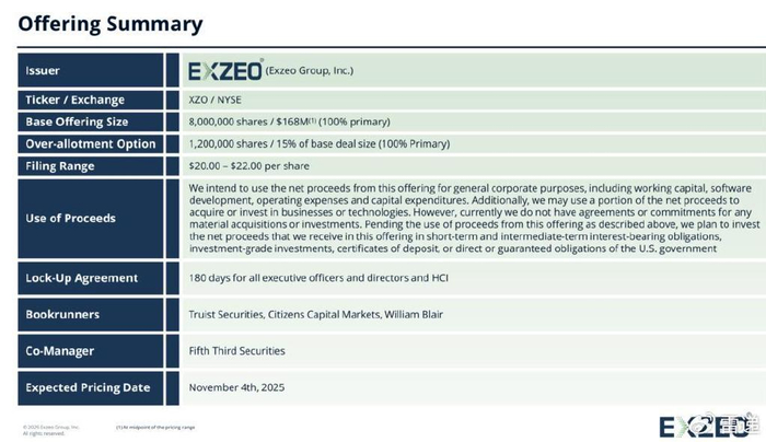 Exzeo发行区间为20美元到22美元,发行800万股,最高募资1.76亿美元,预计估值在19亿美元。