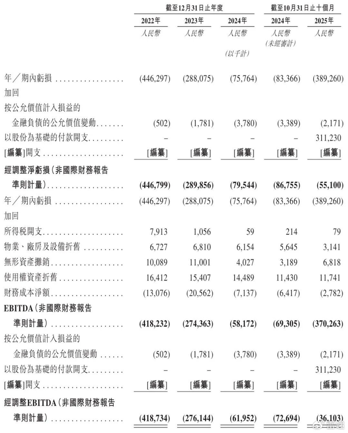 镁信健康2022年、2023年、2024年经调整EBITDA分别为-4亿元、-2.5亿元、-6195万元;2025年前10个月经调整EBITDA为-3610万元。