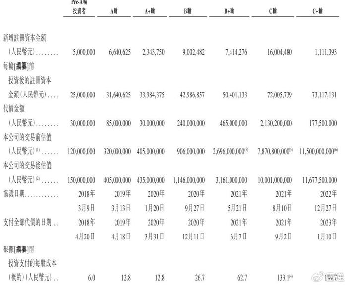 镁信健康B+轮投前估值为27亿元,投后估值为31.61亿元,每股成本为62.7元;完成C轮融资时投前估值为78.71亿元,投后估值为100亿元,每股成本133.1元;完成C+轮融资时投前估值为115亿元,投后估值为116.78亿元,每股成本为159.7元。