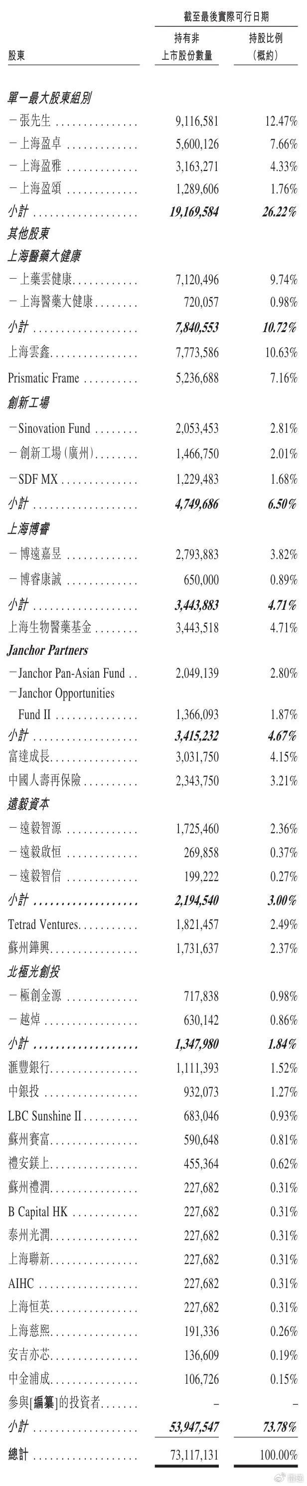 上海博睿通过博远嘉昱持股为3.82%,通过博睿康诚持股为0.89%,一共持股为4.71%;上海生物医药基金持股4.71%,JanchorPartners持股为4.67%,富达成长持股为4.15%,中国人寿再保险持股为3.21%;