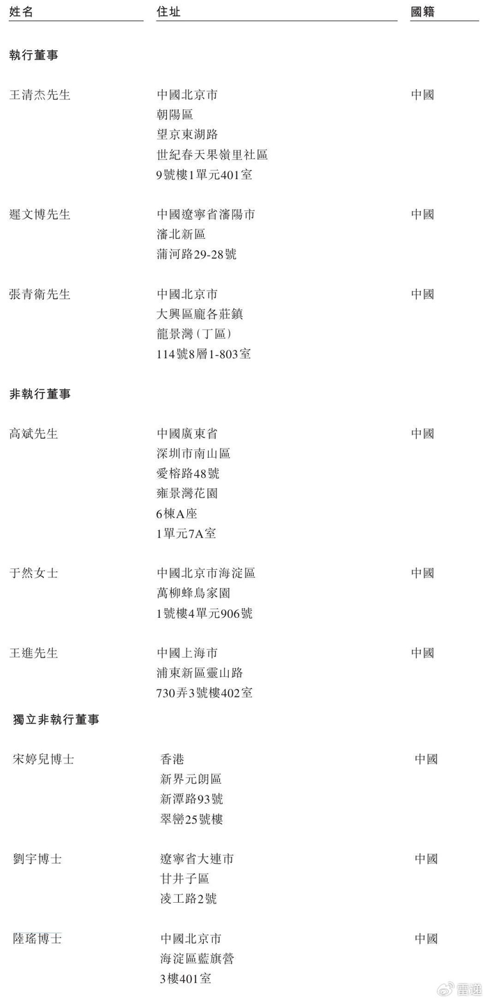 德风新征程执行董事分别为王清杰、迟文博、张青卫;非执行董事分别为高斌、于然女士、王进;独立非执行董事分别为宋婷儿博士、刘宇博士、陆瑶博士。