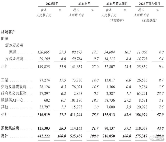 德风新征程2025年前9个月来自能源收入2586万,占营收比例为9.4%;来自工业收入为2659万元,占比为9.7%;来自政府及公共服务收入为6522万元,占比为23.7%;来自系统集成商收入为1.18亿元,占比为43%。
