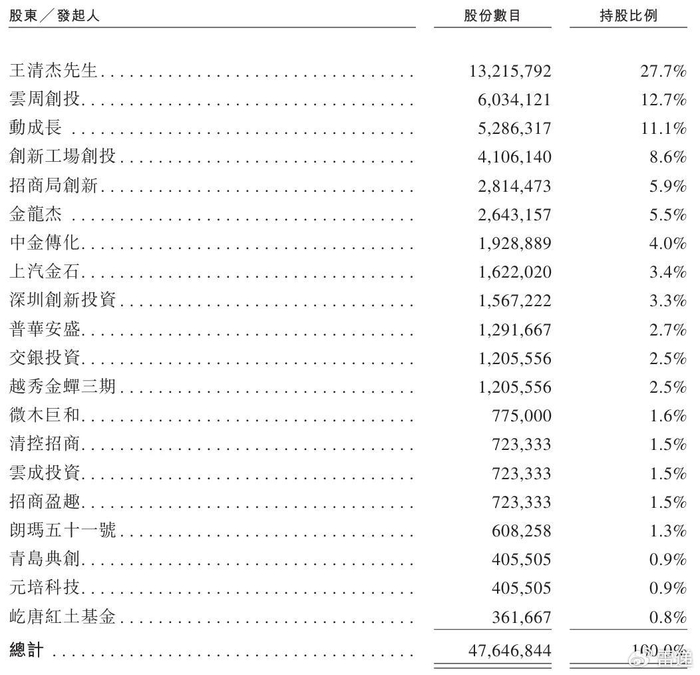云周创投持股为12.7%,创新工场创投持股为8.6%,招商局创新持股为5.9%,中金传化持股为4%;