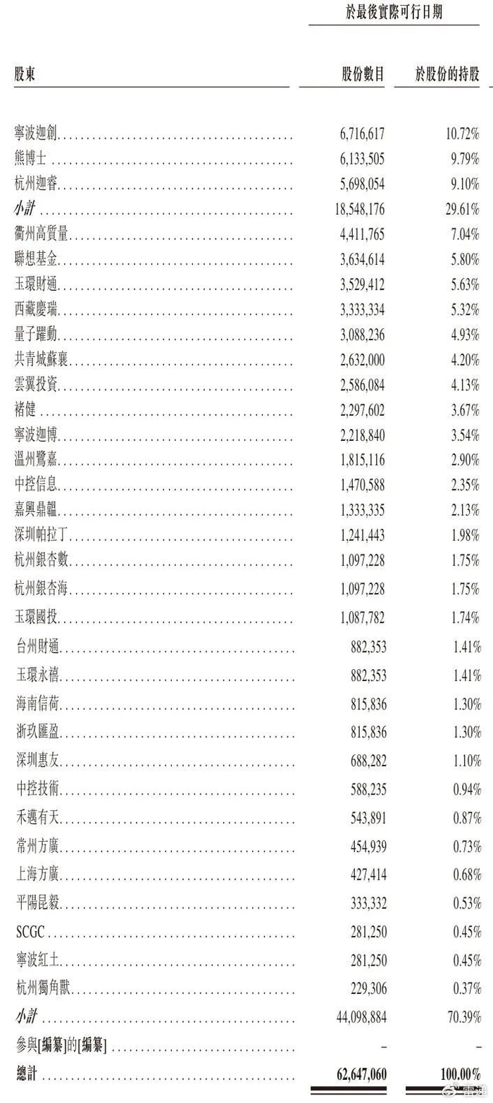 IPO前,迦智科技董事会主席兼执行董事熊蓉博士控制29.61%的投票权,其中,熊蓉博士直接持有9.79%的投票权,宁波迦创及杭州迦睿持有约19.82%的投票权,熊蓉博士为其各自的普通合伙人。
