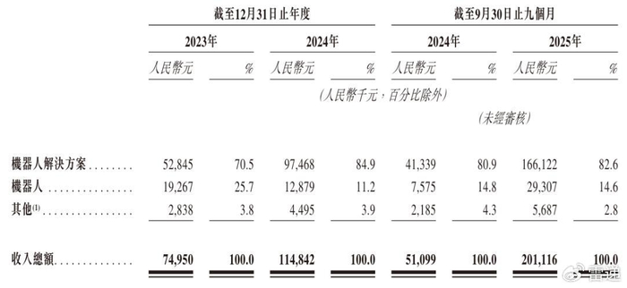 迦智科技2025年前9个月来自机器人解决方案收入为1.66亿元,占比为82.6%;来自机器人收入为2931万元,占比为14.6%。