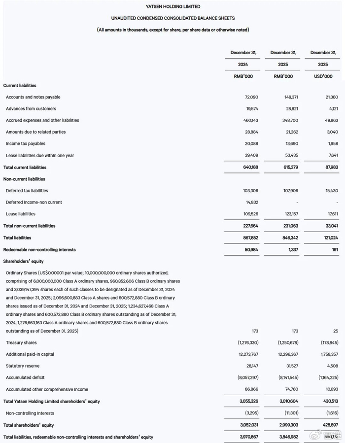 截至2025年12月31日,逸仙电商现有负债为6.15亿元(约8798万美元),非流动负债为2.31亿元(约3304万美元),总负债为8.46亿元。