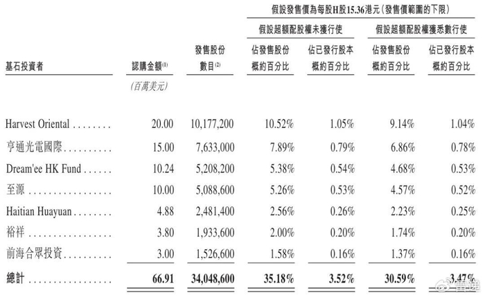 其中,Harvest Oriental认购2000万美元,亨通光电国际认购1500万美元,Dream'ee HK Fund认购1024万美元;至源认购1000万美元,Haitian Huayuan认购488万美元,裕祥认购380万美元,前海合众投资认购300万美元。