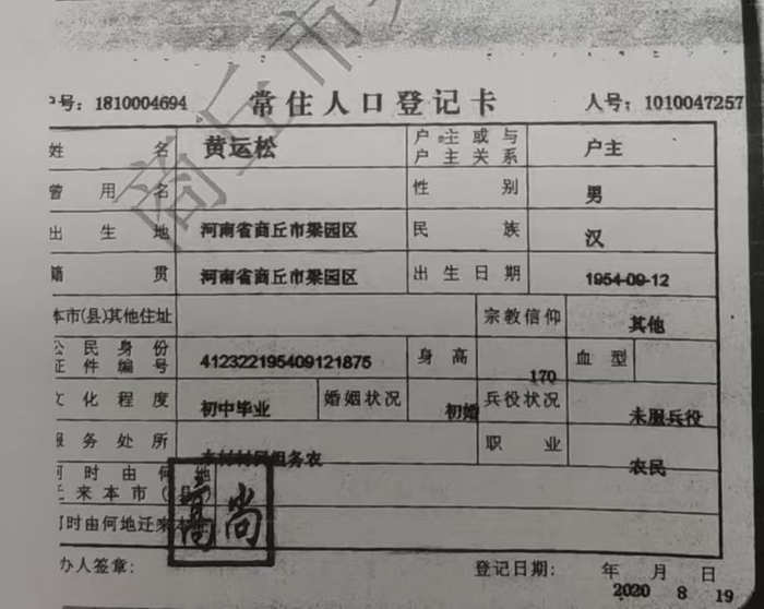 黄某松祖籍是山东人,杨庄村民组村民都知道,24岁时由山东来到河南商丘冯庄村入赘到孙某云家。根据《居民身份证法》第三条的规定,公民身份号码是每个公民唯一的、终身不变的身份代码,由公安机关按照公民身份号码国家标准编制。 因此,无论户口如何迁移,个人的身份证号码始终保持不变,身份证号码具有唯一性和终身性。但黄某松的身份证号码前六位代表的是河南省商丘市而不是山东省那个市,若没有人故意运作造假根本不可能出现这种结果。据杨庄村民委托的律师调查结果户籍证明显示,黄某松身份号码信息和一个叫黄松林的人的身份号码信息一致,那么究竟这个身份证号码是谁的?是谁的户籍进行了造假?退一万步讲,就算黄某松的户籍信息是真实的,那么2020年8月19日才登记到河南省商丘市梁园区平安街道办,有什么资格享受平安街道办冯庄村杨庄组村民的土地征收补偿款。