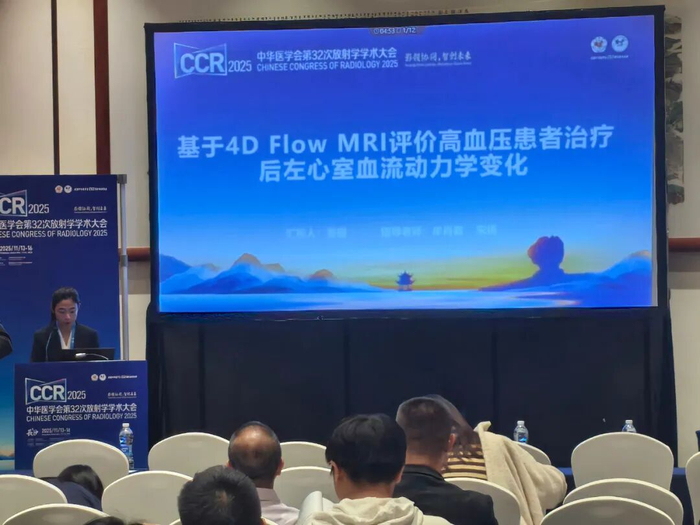 硕士研究生姜珊以《基于4D Flow MRI评价高血压患者治疗后左心室血流动力学变化》为题作大会发言,其研究通过定量分析高血压患者经6个月标准药物治疗后的左室血流动能动态变化,深入探讨血压控制程度、左室重构指标逆转与血流动能改善的关联性,为临床疗效评估提供了极具价值的血流动力学参数参考。
