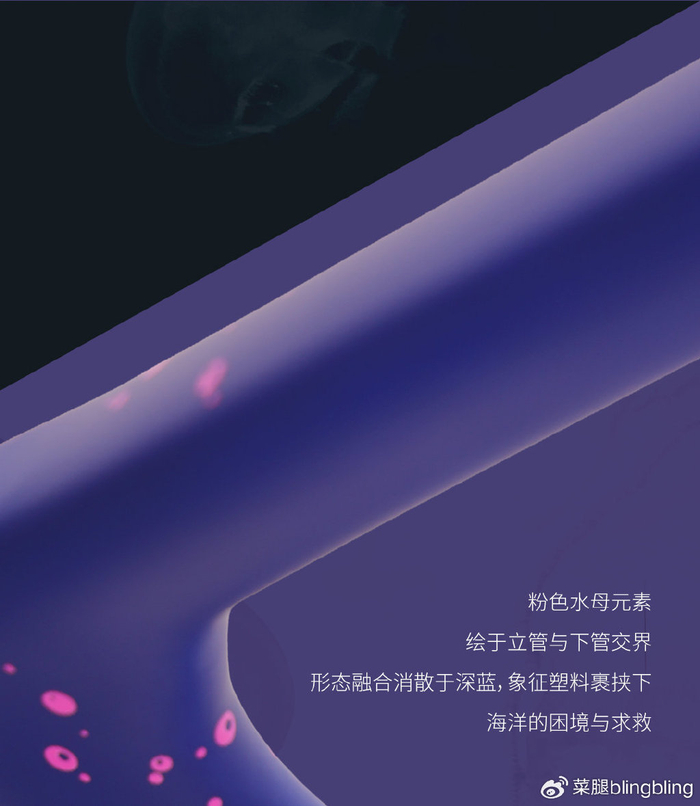 粉色水母元素绘于立管与下管交界,形态融合消散于深蓝,