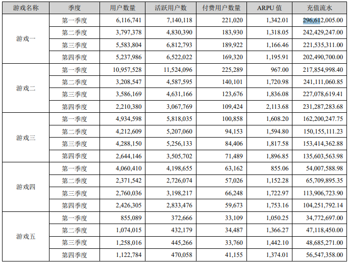 2024年第一至第四季度,该游戏付费用户数量分别为22.10万、18.39万、18.99万、16.93万,ARPU值分别为1342元、1318元、1166元、1196元,充值流水分别为2.97亿元、2.42亿元、2.22亿元、2.02亿元。
