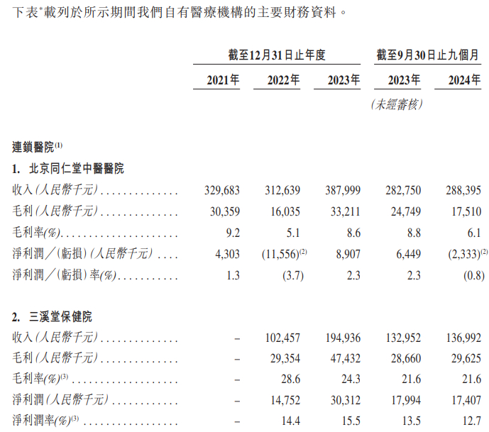 虽然同仁堂医养体系内有多家连锁医院及基层医疗机构,但报告期内,在公司的医疗机构体系中,北京同仁堂中医医院、北京同仁堂第二中医医院及三溪堂保健院共同贡献了大部分收入。2021-2023年及2024年1-9月,同仁堂医养来自上述医院的收入分别为5.14亿元、5.89亿元、7.97亿元、5.6亿元,分别占同期总收入的74.6%、64.6%、69.1%及67.3%。
