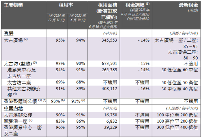 8月1日,太古股份公司A(00019)发布公告,内容涉及太古地产有限公司2025年第二季度的营运数据。公告中提到,太古广场的租用率为94%,较2024年12月31日的95%下降,租金调幅为-14%。整体香港办公楼的租用率为91%,较2024年12月31日的93%下降。