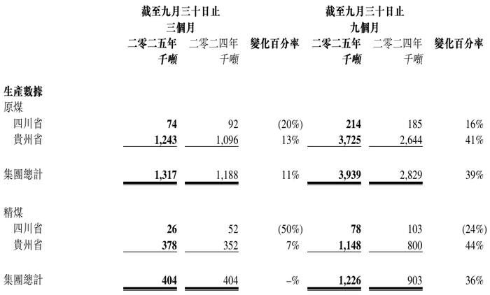 10月16日,恒鼎实业(01393)发布公告,截至2025年9月30日止九个月的第三季度主要经营数据。原煤生产方面,整体集团原煤生产总计为132万吨,同比增长11%。精煤生产方面,整体集团精煤生产总计为40万吨,持平于去年同期。