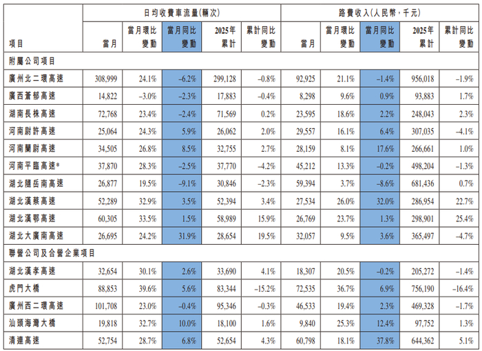 12月30日,越秀交通基建(01052)发布公告,2025年11月未经过审计的营运数据显现出多项变化。