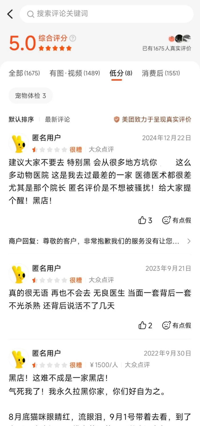 「创业最前线」在美团App上搜索瑞派宠物医院的评价呈现出两极情况,有人打五星,说兽医妙手回春,有人打一星,说医生没有医德只想赚钱。