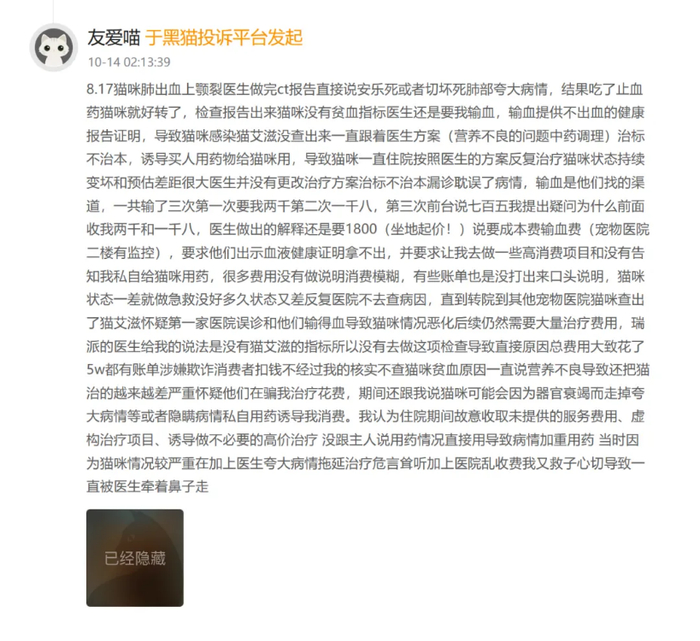图 / 两极分化的评论瑞派宠物医院在黑猫投诉[下载黑猫投诉客户端]平台上存在174项投诉,主要涉及医疗服务质量、收费透明度及服务态度等宠物医疗纠纷。