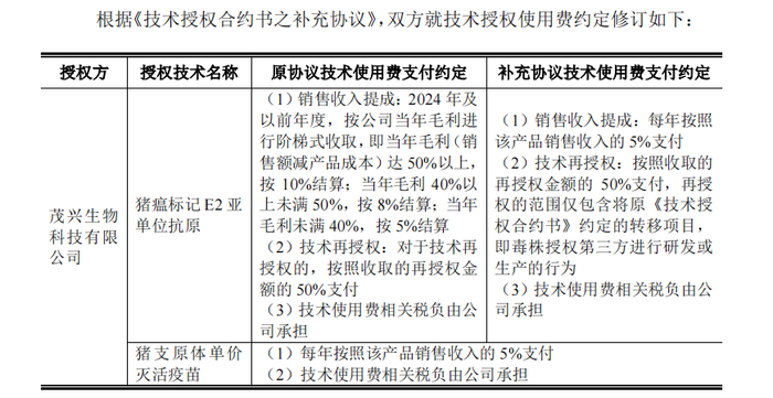 这笔钱从何而来?回复显示,这源于公司与技术授权方茂兴生物的一项“补充协议”。2025年3月,双方对2011年签署的《技术授权合约书》进行了修订,将猪瘟E2疫苗的技术使用费比例由10%调降至5%,并明确了“技术再授权”的范围。