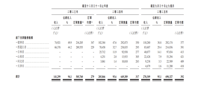 2023年,黑龙江和辽宁两省贡献了公司线下医疗机构收入的94.1%;到2025年前三季度,这一比例虽有所下降,但仍高达68.2%。
