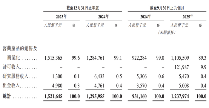 2023年至2025年前三季度,这五款创新药产品所产生收入分别为14.2亿、11.8亿和10.4亿元,占同期医药产品销售及商业化收入的93.7%、91.5%及83.7%。