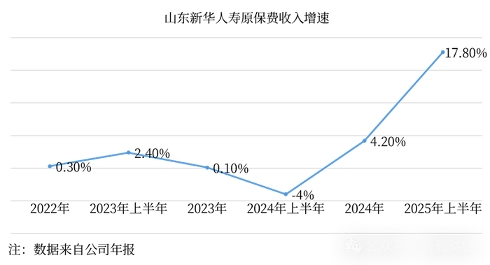 再来看看2025年上半年情况。2025年上半年,山东新华人寿原保费收入同比增长17.8%,保费体量已经是2024年全年的70%,而在2024年上半年,山东新华人寿原保费收入增速还是负数。