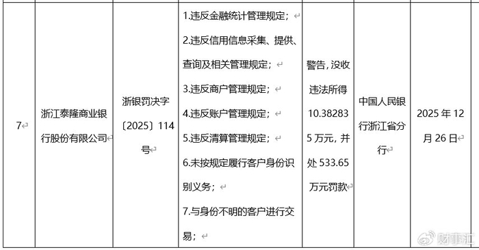 临近2025年末,中国人民银行浙江省分行的一张罚单将浙江泰隆商业银行(下称“泰隆银行”)推上舆论风口——因存在违反金融统计管理规定、未按规定履行客户身份识别义务等八项违规行为,该行被没收违法所得10.38万元,并处以533.65万元罚款。这一处罚金额创下泰隆银行近年纪录。