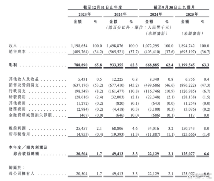 招股书显示,2025年前九个月,半亩花田营收达18.95亿元,同比增长76.7%;经调整净利润1.48亿元,同比增长197.2%。亮眼数据背后,是其销售及营销开支高达8.96亿元,占收入比重47.3%,相当于月均烧掉近1亿元做营销。