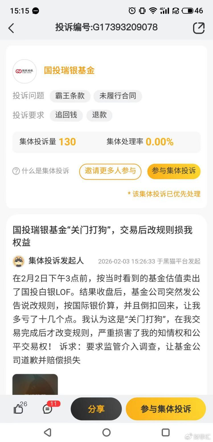 虽然国投瑞银白银期货A(161226.OF)的基金净值正跟随者国际白银价格大涨大跌,但包括可以像ETF一样日内交易的国投白银LOF(161226.SZ),都是伤害已成事实,而黑猫投诉[下载黑猫投诉客户端]平台上,对国投瑞银基金的集体投诉数量已迅速升至130个,另有个人投诉933个,这些投诉大多针对交易规则修改损害投资者权益、霸王条款、未履行合同等。