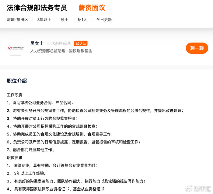 倒是在猎聘网上的一则法律合规部法务专员的招聘启示引起了关注,在51Job、BOSS直聘等招聘平台上未发现此则信息。