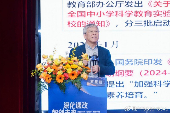 教育部基础教育教学指导科学专委会副主任委员、广西师范大学博士生导师罗星凯教授以《深化课程教学改革 做好科学教育加法》为题作主旨报告。罗教授强调,科学教育已成为国家战略刚需,推进科学教育不仅是补短板,更是课程教学逻辑发展的必然结果。他指出,素养导向下的跨学科主题学习具有现实意义,能够有效撬动课程改革与核心素养落地,科学教育“加法”的核心就在于“育素养”。罗教授分享了广西在高中通用技术课程上的创新实践,通过项目化学习激发学生兴趣,使薄弱学校焕发活力。