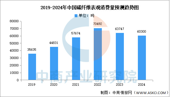 中商产业研究院发布的《2025-2030年中国碳纤维行业市场调查与投资前景研究报告》显示,2024年国内碳纤维行业表观消费量同比减少,2024年碳纤维表观消费量为60300吨,同比下降5.41%。