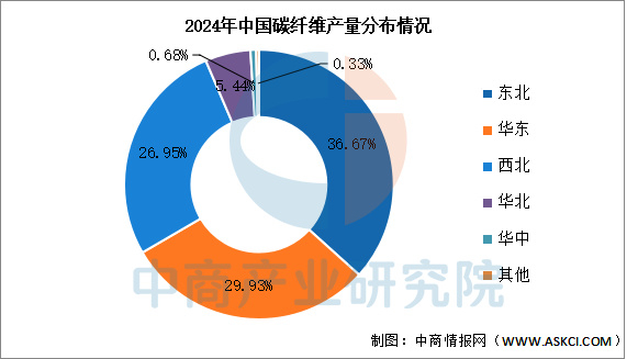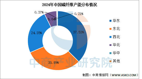 2024年,华东、东北及西北三个低位保持作为我国碳纤维的主要供应地区,合计占比92.77%。其中,华东占比最多,达37.53%。东北、西北、华北、华中占比分别为30.89%、24.35%、6.64%、0.37%。