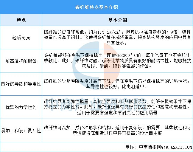 碳纤维的特点包括轻质高强、耐高温和耐腐蚀、良好的导热和导电性、优异的力学性能、易加工和设计灵活性等。具体如图所示:
