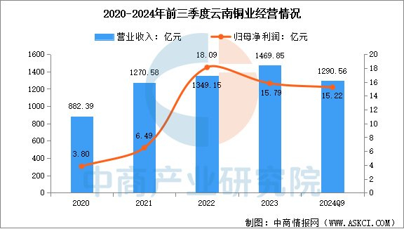 云南铜业股份有限公司前身为1958年成立的原云南冶炼厂。公司于1998年成功在深交所上市,是中铝集团、中国铜业铜产业唯一上市公司和核心平台。公司主要生产阴极铜、黄金、白银、硫酸、铜精矿、铁精矿等产品,综合回收硒、碲、铂、钯、铟、铼等。2024年前三季度,云南铜业营业总收入1290.56亿元,同比上升16.73%,归母净利润15.22亿元,同比上升0.3%。