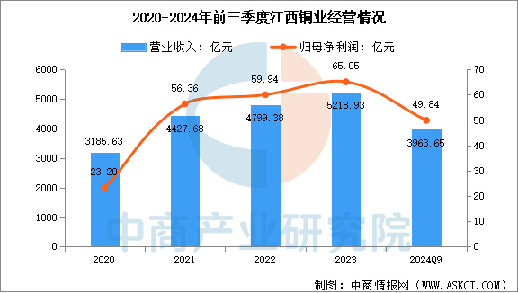 江西铜业的主要业务涵盖铜和黄金的采选、冶炼与加工;稀散金属的提取与加工;硫化工以及贸易等领域,并且在铜以及相关有色金属领域建立了集勘探、采矿、选矿、冶炼、加工于一体的完整产业链,是中国重要的铜、金、银和硫化工生产基地。产品包括:阴极铜、黄金、白银、硫酸、铜杆、铜管、铜箔、硒、碲、铼、铋等 50 多个品种。截至2024年前三季度,江西铜业营业总收入3963.65亿元,同比下降0.8%,归母净利润49.84亿元,同比上升0.83%。