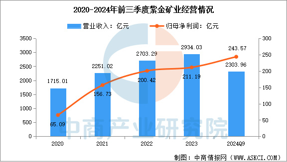 紫金矿业集团股份有限公司是一家在全球范围内从事铜、金、锌、锂、银、钼等金属矿产资源勘查、开发及工程设计、技术应用研究的大型跨国矿业集团,在香港H股和上海A股整体上市。截至2024年6月,按控股企业100%口径及联营合营企业权益口径计算,紫金矿业保有探明、控制及推断的总资源量为铜10467万吨、金3528吨、锌(铅)1212万吨、银28380吨,锂(LCE)1411万吨。2024年前三季度,紫金矿业实现营业收入2303.96亿元,同比增长2.39%,归母净利润为243.57亿元,同比增长50.68%。