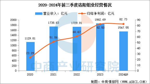 洛阳栾川钼业集团股份有限公司主要从事基本金属、稀有金属的采、选、冶等矿山采掘及加工业务和矿产贸易业务,公司是全球领先的铜、钴、钼、钨、铌生产商。2023年,洛阳钼业产铜41.95万吨,旗下拥有两大世界级铜钴矿TFM和KFM,是全球重要铜生产商,目前主要向全球市场销售阴极铜和铜精矿。2024年前三季度,洛阳钼业实现营业收入1547.55亿元,同比增长17.52%,归母净利润82.73亿元,同比增长238.62%。