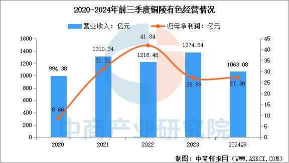铜陵有色于1992年经安徽省体改委批准成立,1996年在深圳证券交易所上市,成为中国铜工业板块第一股。铜陵有色主要从事铜矿勘探、采选、冶炼和深加工等业务,是目前国内产业链最为完整的综合性铜业生产企业之一。2024年前三季度,铜陵有色营业总收入1063.08亿元,同比上升3.62%,归母净利润27.30亿元,同比上升5.97%。