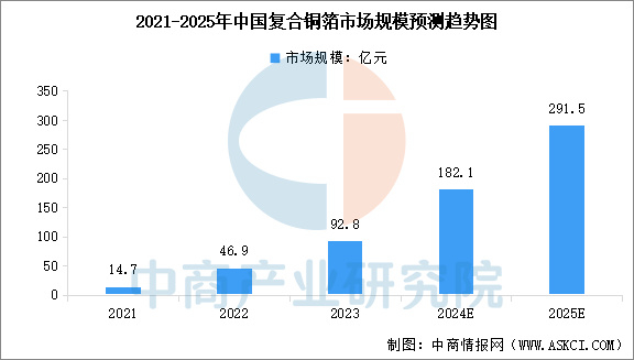 当前复合铜箔已进入材料认证、装车试验关键节点,有望实现复合铜箔规模化应用0到1的突破。中商产业研究院发布的《2025-2030年中国复合铜箔产业前景预测与战略投资机会洞察报告》显示,2022年中国复合铜箔市场规模达到46.9亿元,2023年达到约92.8亿元。中商产业研究院分析师预测,2025年中国复合铜箔市场规模将达到291.5亿元。
