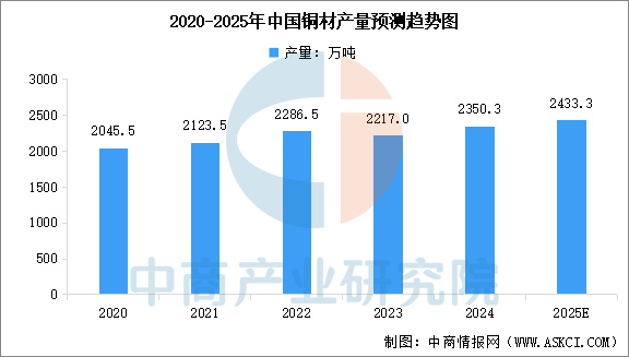 铜材在工业中具有至关重要的作用,其优良的导电性、导热性、耐腐蚀性和机械性能,使其广泛应用于电气、电子、机械制造、建筑、交通运输等多个领域。中商产业研究院发布的《2025-2030年中国铜产业市场深度分析及发展趋势预测报告》显示,2024年中国铜材产量达2350.3万吨,近五年年均复合增长率达3.53%。中商产业研究院分析师预测,2025年中国铜材产量将达到2433.3万吨。