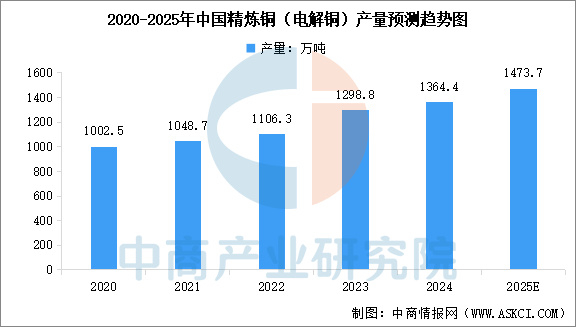 我国铜产业迅速发展,已成为全球最大的铜产品生产国和消费国。中商产业研究院发布的《2025-2030年中国铜产业市场深度分析及发展趋势预测报告》显示,2024年中国精炼铜产量世界第一,达到1364.4万吨,有力支撑了新能源、新一代信息技术等战略性新兴产业发展。中商产业研究院分析师预测,2025年中国精炼铜产量将达到1473.7万吨。